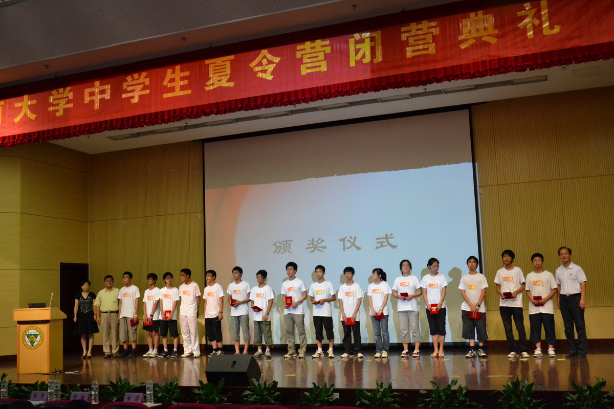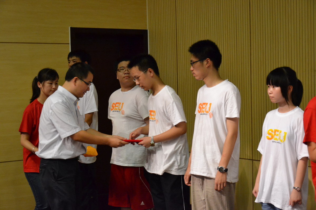 蔡亮副处长在会上宣布了东南大学2011年中学生夏令营获奖名单。由肖健书记、高嵩书记、李涛书记为获得东南大学2011年中学生学夏令营二等奖的50名同学颁发获奖证书。蔡亮副处长为获得东南大学2011年中学生夏令营一等奖的18名同学颁发获奖证书,并面向所有获奖学生解读了我校相关招生政策,鼓励大家2012年积极报考东南大学。