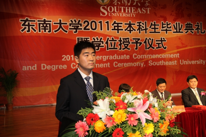 数学系成龙同学代表2011届本科毕业生在东南大学本科生毕业典礼上的讲话 尊敬的各位领导、各位来宾,亲爱的老师们、同学们: 大家好! 我叫成龙,来自数学系,是一名即将毕业的07级本科生。 今天,我很荣幸能在这放飞梦想的时刻,代表东南大学2011届全体毕业生向我们的母校道别,向我们的老师道别,向我们朝夕相处了四年的同窗道别,也向这段不能忘怀的岁月道别! 在东大的这四年,我们留下了一生最美好的记忆: 那一天,父母亲人送我们报道,我们兴奋的脸上还留着几分稚气; 那一天,我们在教二109考前通宵突击,第二天早上带着忐忑不安的心情“悲壮的”走向考场; 那一天,我们挤在人文讲座排队的队伍中,期待着名家大师精彩的讲演; 那一天,我们忙碌在各个社团,和兄弟姐妹们一起释放着青春的激情; 那一天,我们在图书馆门前为国殇默哀,在食堂门口为同胞们捐款; 那一天,我们勇敢表白,坦露自己的心声,和那个“她”一起牵手走遍九龙湖的每个角落。 最美的大学时光过去了,一生只一次,一次忆一生。曾经,我们也抱怨食堂的饭菜太差,宿舍没有空调,自习还要占座;而如今,篮球场装了灯,宿舍、教室也都有了空调,虽然我们都用不上了,但别人提起时,我们仍然会兴奋,会自豪。因为母校就是那个我们每天数落她八遍却不许别人说她一个不字的地方。 太多太多的情景值得我们去留恋。留恋相识的老师,留恋相知的朋友,留恋越来越美的九龙湖。 毕业是伤感而张扬的告别――低眉处无奈流年似水,扬帆行有志风华如火。 感谢母校,为我们提供了学习求知的环境,为我们成长、成才构筑了坚实的平台;四年里,我们感动于母校为我们付出的一切,我们自豪自己是一名东大学子! 感谢老师,四年里您教会我们很多,是您的严谨、渊博和爱,让我们真正能够成为东大的学生,真正能够理解东南大学那止于至善、静水深流的含义。学生即将远行,就让我们深情的道一声:老师,您辛苦了! 感谢父母,您们总是默默的付出,将朴实无华的爱融入生活的点滴。在这里,请允许我代表所有的同学向我们的父母道一声感谢,感谢您们二十多年来的含辛茹苦。 感谢同窗,四年里我们互相关心,相互支持。“睡在我上铺的兄弟”,我们会永远珍藏这份情感。我们站在离别的浪尖难舍这浓浓情意,但我们清楚的知道,在未来前进的路上,我们更需要的是一份“长风破浪会有时,直挂云帆济沧海”般的从容与坚定。毕业,我们不说再见! 毕业是大学四年的精彩谢幕,更是下一段征程的正式开始。 亲爱的07级同学们,我们作为东南大学本科学生的时代即将结束,但是,作一个东大人的时代才刚刚开始,这是我们一辈子的事业,一生的光荣!让我们牢记“止于至善”的校训,“士不可以不弘毅,任重而道远”。 一个人的力量或许很小,但是我们4000人的力量便不容忽视,所以我们永远不应该怀疑,一群有梦想,又肯为梦想坚持付出的人,是有能力改变这世界的,请让时间作证! 我相信有一天,我们的母校东南大学会站在世界名校之巅, 我相信有一天,我们会拥有最美丽的校园; 我相信有一天,中国的爱因斯坦、比尔盖茨会在东南大学出现,而这希望就在我们中间。 最后,祝我们的母校东南大学明天更美好! |