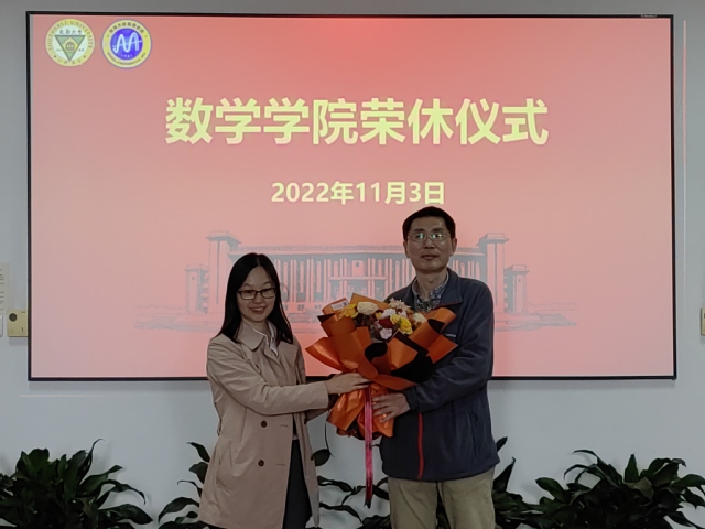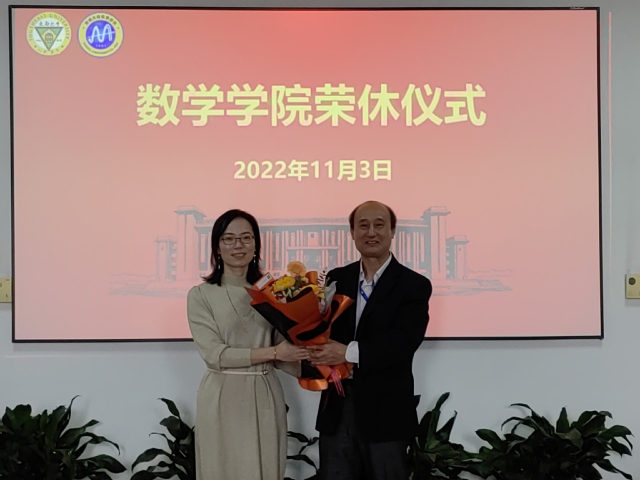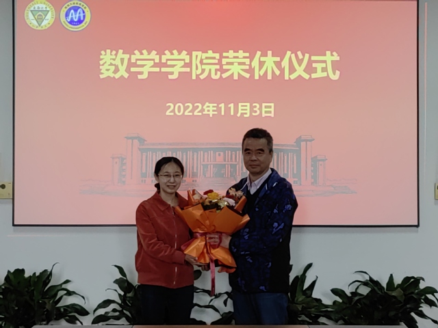 首先,吴映红书记向四位荣休教师为学院建设和发展做出的重要贡献表示衷心感谢。举办教师荣休仪式,对学院而言,是对各位老师为学院发展所做出的贡献的铭记与感恩;对荣休教师而言,是对他们过去工作的总结与肯定;对青年教师而言,是希望他们能学习荣休教师严谨治学、辛勤耕耘的工作态度。吴映红书记在发言中表示,四位老师数十年如一日,将汗水、热情和智慧投入到工作岗位,在数学学院留下了精彩的篇章,为社会培育了一大批优秀人才。